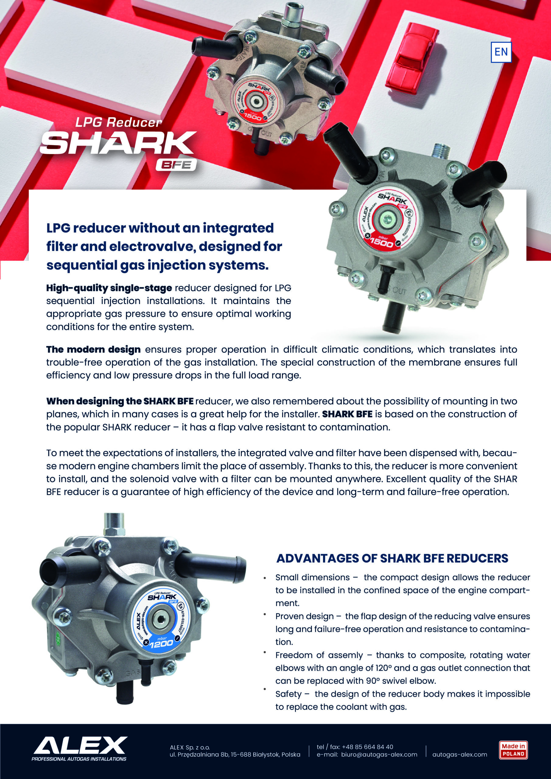 It's a high-quality single-stage reducer designed for LPG sequential injection installations. It maintains the appropriate gas pressure to ensure optimal working conditions for the entire system. The modern design ensures proper operation in difficult climatic conditions, which translates into trouble-free operation of the gas installation.