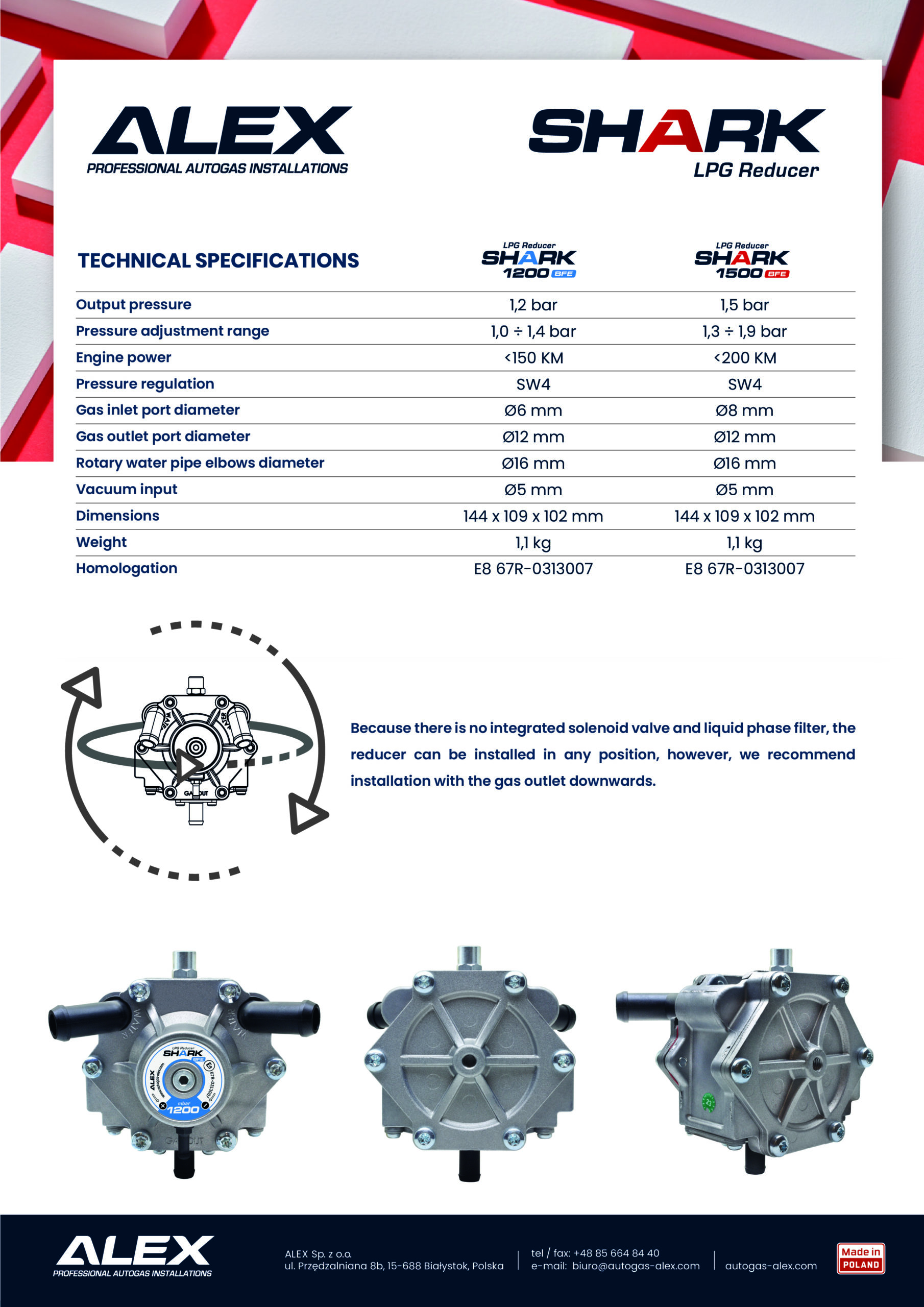 SHARK BFE 1500 is an LPG reducer without an integrated filter and a solenoid valve, designed for engines up to 200 HP*(*naturally aspirated and turbocharged engine up to 0.60 bar. For a liquid flow of 35L/min and a coolant temperature of 80°C).