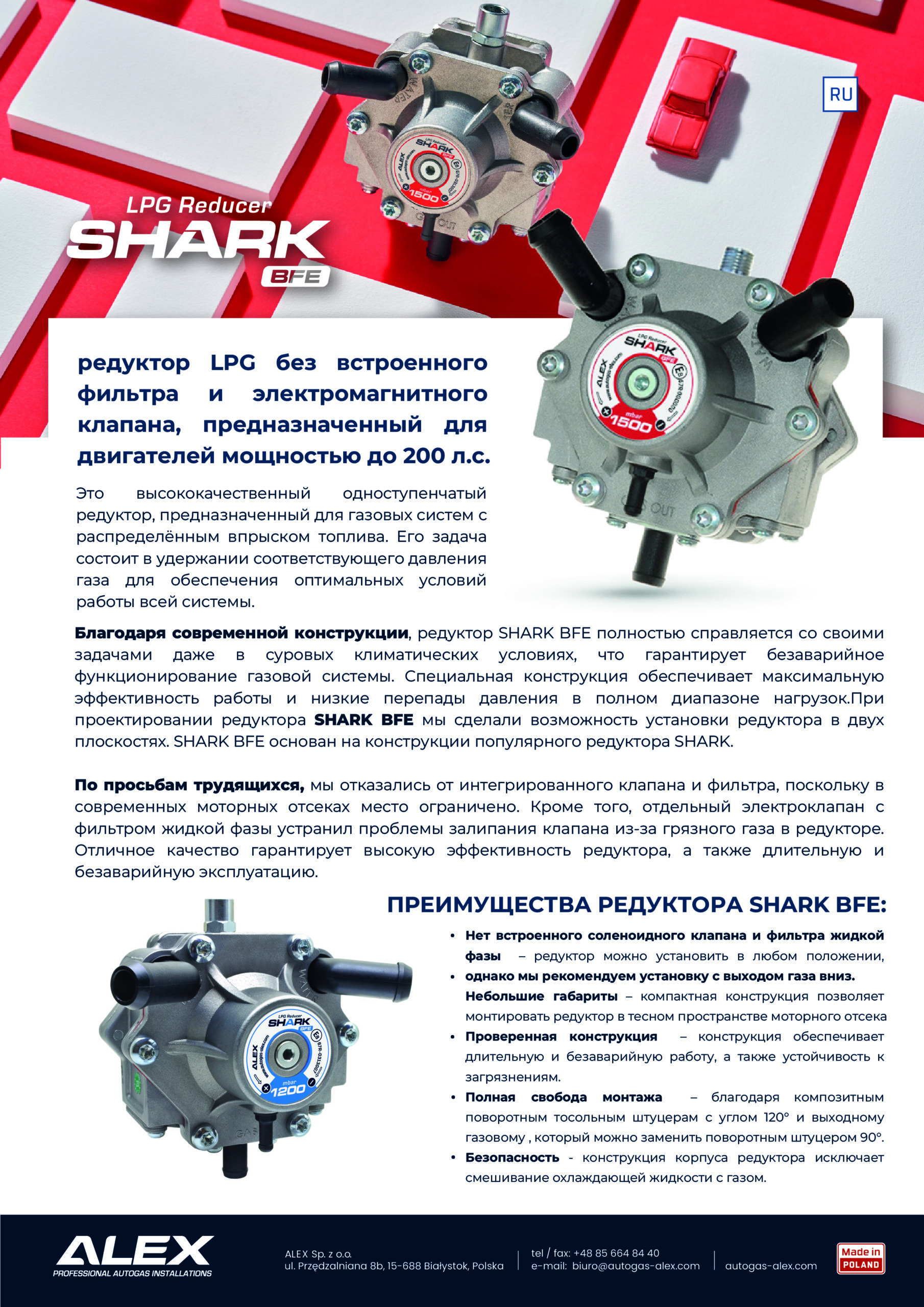 Это высококачественный одноступенчатый редуктор, предназначенный для газовых систем с распределённым впрыском топлива. Его задача состоит в удержании соответствующего давления газа для обеспечения оптимальных условий работы всей системы. Благодаря современной конструкции, редуктор SHARK BFE полностью справляется со своими задачами даже в суровых климатических условиях, что гарантирует безаварийное функционирование газовой системы.